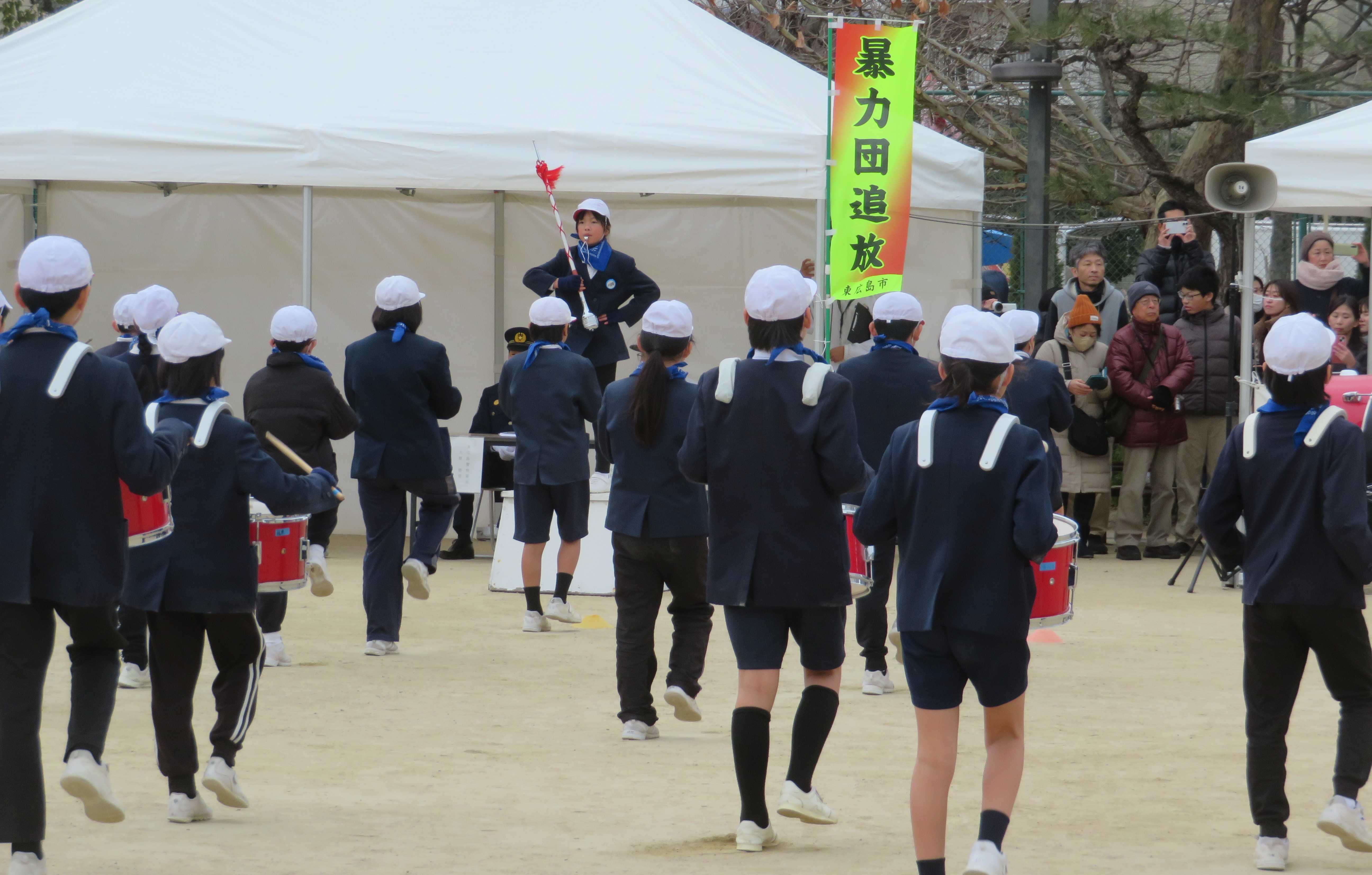 令和8年2月7日(土)東広島市役所北側西条中央公園並びにその周辺において『第16回暴力追放・排除・進出阻止に向けた街頭パレード』が行われました。当日は、全国的寒波襲来で大変寒い中ではありましたが、防犯連合会他関係団体の方々、鼓笛演奏に参加の西条小学校、三つ城小学校の児童の皆さん等々約700人が参加されました。