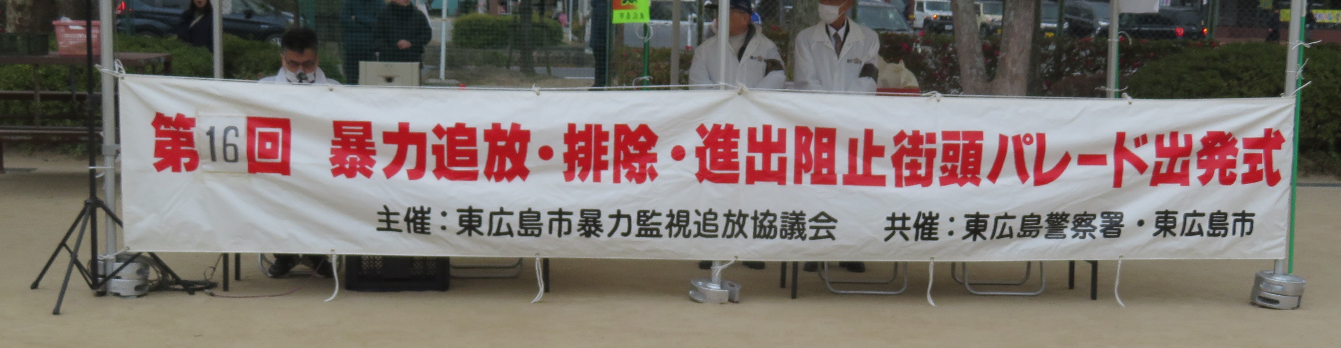 パレードは、安本政基東広島市暴力監視追放協議会会長、大野勝俊東広島警察署長、続いて高垣広徳市長からのあいさつ、暴力団の現状などの話があり、更に西条小学校、並びに三つ城小学校の鼓笛隊演奏が行われました。