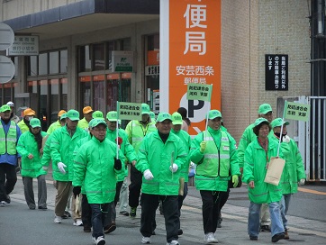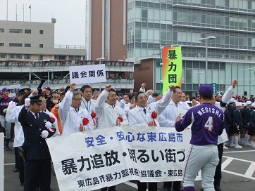 2月7日(土)、本年で第10回を迎える「暴力追放・阻止・進出阻止街頭パレード」が東広島市役所駐車場及び付近街路において、市民約1600名が参加する中、盛大に行われた。水本洋一会長の挨拶、石宮警察署長、藏田市長の挨拶に続き、「暴力追放・排除・進出阻止決議文の朗読及び採択が行われた。この後、三ツ城小学校と西条小学校鼓笛隊の演奏があり、全員元気よく市中にシュプレヒコールしながら出発していった。趣旨に賛同する私たち東広島市防犯連合会も、150名以上が参加。