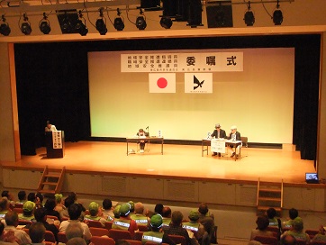 委嘱式は、委嘱状の授与に続き宮川孝央会長、上堀次徳警察署長の挨拶、藏田義雄市長の祝辞を頂いた後、地域安全推進員総代の森澤薫さまの力強い決意表明が行われました。後半の部では、老人会「万年青会」の沼田川劇団総勢7名の「特殊詐欺の寸劇」と比治山大学上之園先生による「子供とともに安全をつくる」と題した講演が行われ、参加者約130名は最後まで楽しみながら聞き入っておられました。