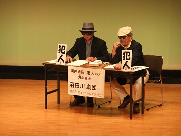 沼田川劇団による特殊詐欺の寸劇は「警察を騙るなりすまし」と「息子を騙るなりすまし」という詐欺の常套手段をテーマとした二つの演目で上演いただきました。皆さん老人会で楽しみながら練習されていて、内容がしっかりしているとともに、なかなかユーモアがあり、観客の皆さんもクスクス笑いながら見入っていました。