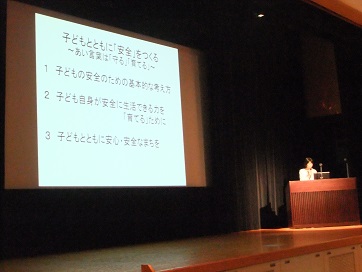 次にあった、比治山大学上之園先生のご講演は「子どもとともに安全をつくる」というテーマでしたが、最初に小学校1年生の「生活科」の教科書に見守り活動のことが書かれてあることが紹介され、日ごろ見守り活動をされている地域安全推進員の皆さん、なんとなく誇らしい気持ちのなられたようでした。子供たちが遊びを通じて防犯力を養っていく様子や地域の大人たちとの様々な触れ合いを通じて子供たちと一緒に地域安全が醸成されていくことなどの話があり、最後に東広島市で「自分の安全を自分自身で守ることのできる子供」が育ちやがて「安心・安全な街を共に創る未来の大人たちになってくれる」そんな希望のあるお話でありました。
