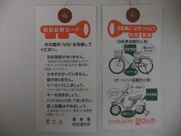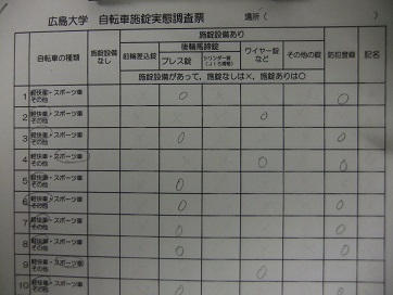 東広島市内における盗難事案に対する自転車盗被害はかなり多い、その半数以上が、無施錠かカギをつけたままという。そこで、大学構内の駐輪場を対象に自転車錠の有無や、カギの種類が盗難され難いものであるか、などの調査を実施するとともに、問題のある自転車には注意喚起のため診断カードの貼り付け、さらには、ツーロックを呼び掛けワイヤー鍵を配るなどを行った。
