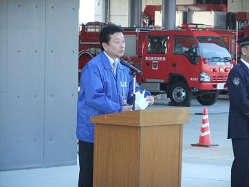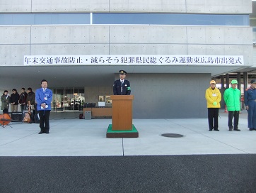 出発式は東広島市長の挨拶を危機管理課石丸泰三課長が読み上げ、続いて警察署上堀次徳署長から「年末に増える交通事故、犯罪を市民の皆さんとともに抑止していこう」といった決意がありました。
