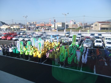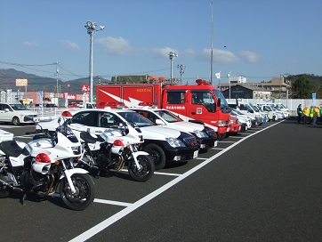 この後、白バイ先導の元、パトカー、消防車に続き、交通安全協会広報車、防犯ボランティアの青色回転灯パトロール車20台、各種車両が市内に出発していきました。