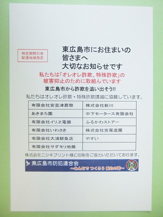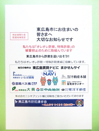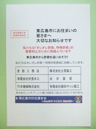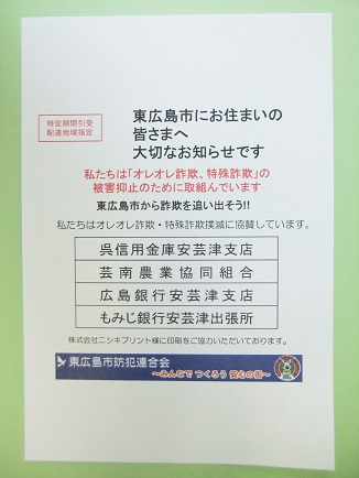 東広島市防犯連合会は日本郵便株式会社中国支社と協力し、郵便局の暑中・残暑見舞いはがき「かもめーる」を使用した特殊詐欺被害防止啓発はがきを5,000世帯に配布することにしました。
