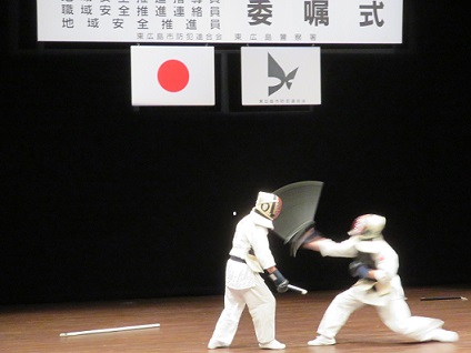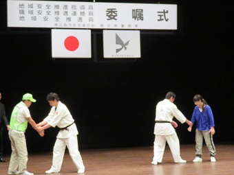また、アトラクションとして警察署署員による逮捕術の紹介と会場からボランティアの方も参加されての護身術の実技指導が行われた。ステージでの若い警察官による本気度たっぷりの日頃の稽古の披露に会場は「思わず息をのむ」実戦さながら迫力でありました。