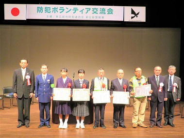 防犯連合会と東広島警察署の共催による防犯ボランティア交流会が10月21日東広島市芸術文化ホール「くらら」にて開催された。市内の地域安全推進員、見守り隊の隊員、少年補導協助員、交通指導員、青パト隊のメンバー、そして一般市民等約200名が会場の小ホールに集まり、活動発表や会員間の交流を深めた。