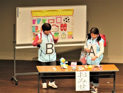 警察署生活安全課丸子少年育成官から紹介説明があったのち協助員の方々が、実際に中学校に出向き行う「万引き防止のための寸劇」を実演された。