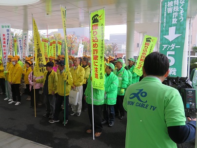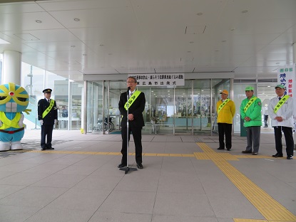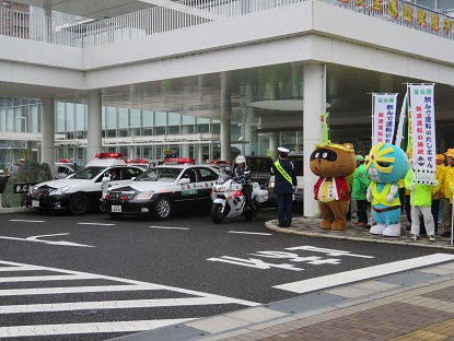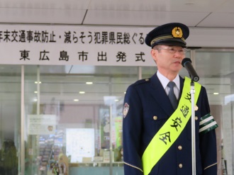 槇原東広島副市長、山田谷東広島警察署長から「年末の交通事故防止や特殊詐欺にあわないように」などの話があり、その後、東広島警察の白バイを先頭に防犯連合会の青パトや交通安全協会車両等が市内に向け出発した。