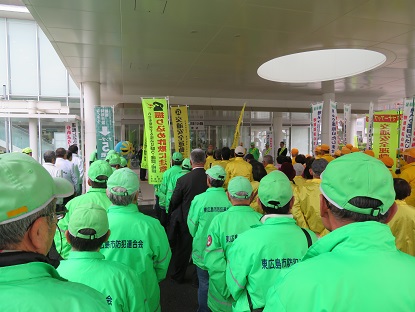 11月30日午前中、東広島市役所正門玄関前において、年末交通事故防止・減らそう犯罪県民総ぐるみ運動「東広島市出発式」が市内関係団体の参加のもと行われました。参加団体は、東広島交通安全協会、東広島市防犯連合会、東広島市暴力監視追放協議会、東広島市金融機関防犯組合、交通安全母の会、広島県警友会東広島支部、老人クラブ連合会、PTA連合会等で約200名の参加がありました。
