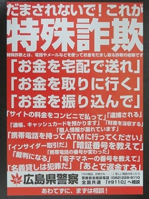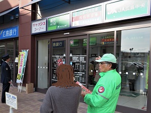 相変わらず増加する特殊詐欺被害に対し、東広島警察署と防犯連合会は10月13日に続き、12月15日年金支給日に合わせ、市内大型店舗ATMコーナーにおいて「特殊詐欺被害防止」のチラシなどを配布する啓発活動を行った。