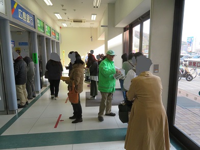 今回は午前中、ゆめタウン黒瀬店、午後フジグラン東広島店において、冒頭の写真にあるチラシ、添付PDFにあるチラシならびに特殊詐欺被害防止を訴えたシール付きマスクをATMに立ち並ぶ市民の方に配布した。防犯連合会からのご協力はそれぞれ地元の地域安全推進員の方々でした。