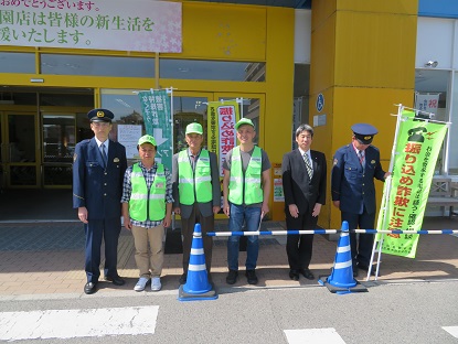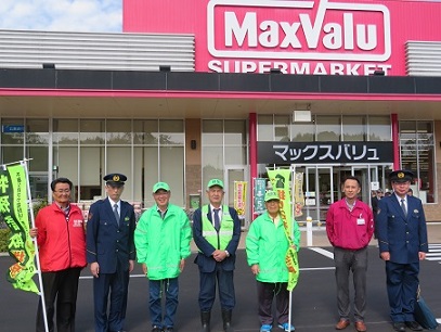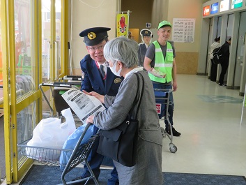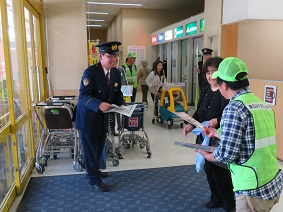今回は、ゆめタウン学園店とマックスバリュー高屋店においてそれぞれの地域で防犯ボランティア活動をされている地域安全推進員の方と警察署員、市役所職員により行われました。