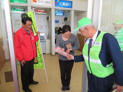 東広島市防犯連合会と東広島警察署、東広島市がタイアップし今月も年金支給日(4月13日)に市内ATMコーナーにおいて「特殊詐欺撲滅」に向けた啓発キャンペーンを実施しました。