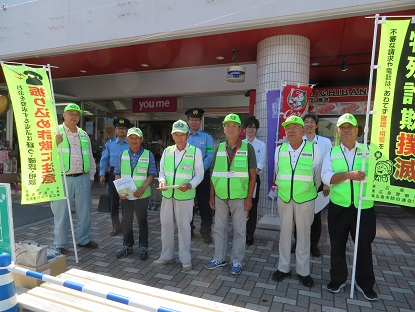 防犯連合会の防犯ボランティアの皆さんと東広島警察署並びに東広島市は共同して特殊詐欺被害防止啓発活動を6月15日の年金支給日に「JA広島中央豊栄支店前」「ショージ豊栄店前」並びに「ゆめタウン黒瀬店」において行いました。