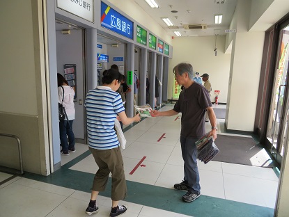 8月17日、東広島警察署、東広島市、並びに地域の防犯ボランティアの皆さんによりフジグラン東広島店ATMコーナー及び店舗入り口付近において特殊詐欺被害防止の啓発活動を行った。
