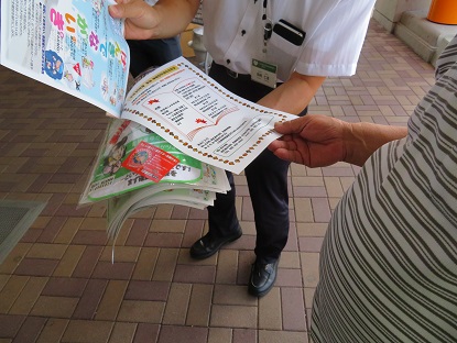 フジグラン入り口にてチラシ配布する防犯ボランティアの方