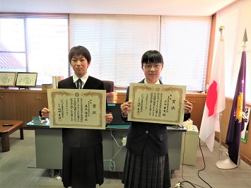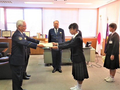 広島県防犯連合会(会長 池田晃治)が募集する「防犯ポスター・防犯作文」における東広島市内中学生の部で入選された方に対し、11月7日東広島警察署において益田泰伸次長からの表彰伝達式が行われた。