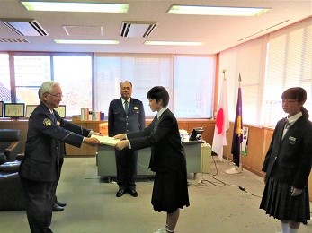 東広島警察署益田次長から表彰状を授与される桑本陽菜さん