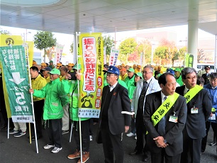 11月30日午前中、東広島市役所正門玄関前において、年末交通事故防止・減らそう犯罪県民総ぐるみ運動「東広島市出発式」が市内関係団体の参加のもと行われました。東広島交通安全協会、東広島市防犯連合会、東広島市暴力監視追放協議会、東広島市金融機関防犯組合、交通安全母の会、広島県警友会東広島支部などから約150名の参加がありました。