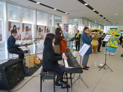 白バイ、パトカー、青パトの出発に先立ち、市役所本館ロビーにおいて、広島大学JAZZ研究会のメンバーの皆さんが軽快なジャズを演奏し参加者を楽しませていました。