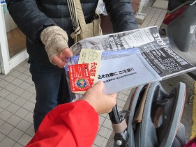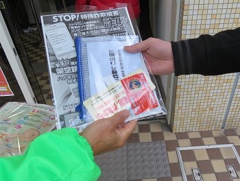 それぞれの場所において「特殊詐欺被害撲滅のチラシ」「特殊詐欺被害撲滅を印刷した預金通帳用ポーチ」「電話機付近に貼る警告シール」並びに「交通安全啓発チラシ」をセットした袋を店舗利用者、ATM利用者に配布した。