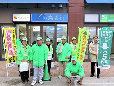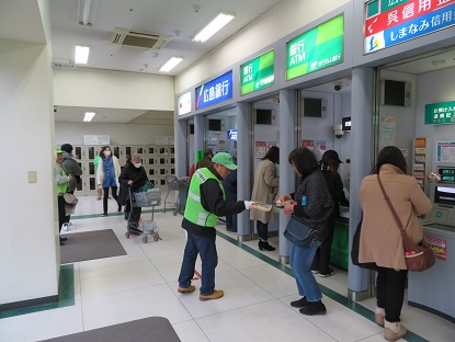 防犯連合会、東広島警察署、東広島市は地域安全推進員など防犯ボランティアの方々の協力のもと、恒例の年金支給日における「特殊詐欺被害防止啓発活動」を「ゆめタウン学園店」並びに「フジグラン東広島店」において行った。