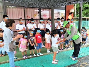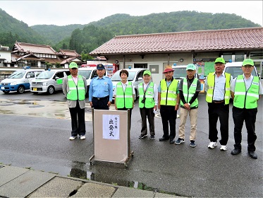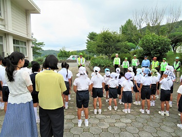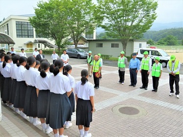 あいにくの雨模様ではあったが、午前10時しゃくなげ館に集合し出発式を行い、その後、町内をパレードしつつ、認定保育園、竹仁小学校、久芳小学校、福冨中学校に立ち寄りプレゼントを渡すなど、日ごろの見守り活動とは一味違う交流を図ることが出来ていた。