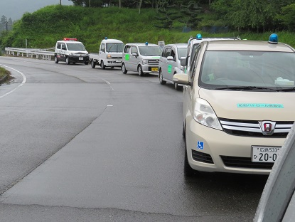 モシカ号先頭に全7台のパレード、しんがりは駐在所パトカー
