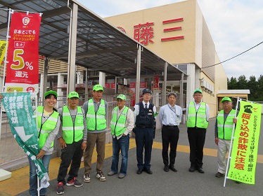 東広島市防犯連合会、東広島警察並びに東広島市は全国地域安全運動期間(10月11日から20日)の活動の第一弾として、年金支給日に合わせ、ショージ志和店前、ゆめタウン黒瀬店前、藤三安芸津店前において、買い物客を対象として、地元の地域安全推進員など防犯ボランティアの応援を頂き、特殊詐欺被害撲滅に向けた啓発活動を行った。