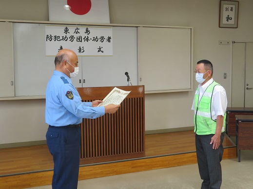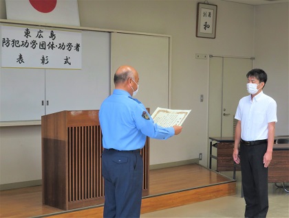 例年であれば、広島県防犯連合会総会、東広島市防犯連合会総会においてそれぞれ表彰式典を執り行っていたが本年は、新型コロナウイルス渦中にあることから皆様に集まっていただいての総会は中止となりました。このため、改めて7月1日、東広島警察署において東広島に関係される方のみの表彰式が行われました。