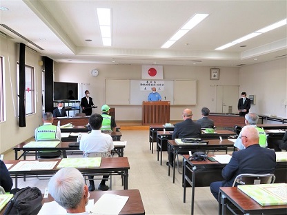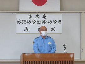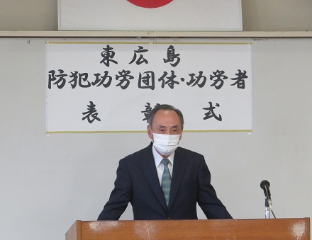 表彰状授与の後は、東広島警察署 若林栄児署長から、並びに東広島市防犯連合会会 宮川孝央会長からお祝辞がありました。署長からは「長年防犯ボランティア活動にご尽力いただいたことに対する謝意、また今日的には犯罪が随分減少してきているが、これもひとえに防犯ボランティア活動のお力添えであること、一方、子供・女性・高齢者等の安全確保やより巧妙化する特殊詐欺対策など取り組むべき課題も多くあり、今後も引き続き防犯ボランティアの方々のこれまでに培われた豊富な経験と知識を生かされたお力添えを頂きたい」などが述べられた。