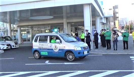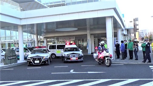 式典は高垣東広島市長、若林東広島警察署長の挨拶があり、続いて、白バイ、警察パトカーに先導され、交通安全協会車両、防犯連合会青パト「モシカ号」さらには青パト5台が市内に出発していった。