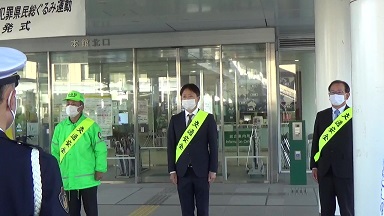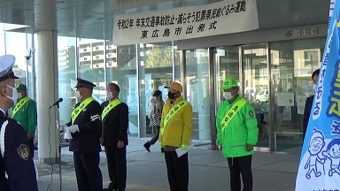 『年末交通事故防止・減らそう犯罪県民総ぐるみ運動「東広島市出発式」』(正式名称)が12月1日東広島市役所本館正面玄関前にて行われた。