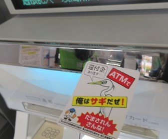令和3年1月からの特殊詐欺被害の現状は、広島県内が9月末時点で3億円越え、東広島市内が10月26日時点で1100万円越えの状況にある。特に最近ATMに誘導してだまし取る手口が横行していることから、この度写真にある洒落のきいた、すっきりしたデザインのポップを取り付け、絶対、被害に遭わないよう最後のタイミングとなるATM前にて注意喚起を促すことにした。