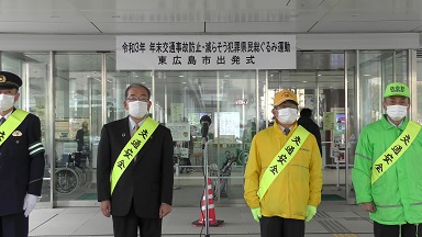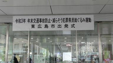 12月1日、「令和3年年末交通事故防止・減らそう犯罪県民総ぐるみ運動東広島市出発式」が東広島市役所玄関ロビー前にて行われ、関係者が見守る中、白バイを先頭に警察パトカー、交通安全協会車両、防犯連合会青パト隊が市中に出発していった。