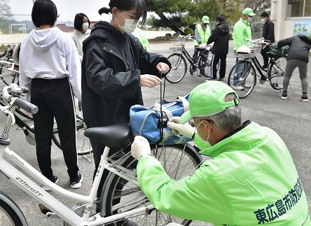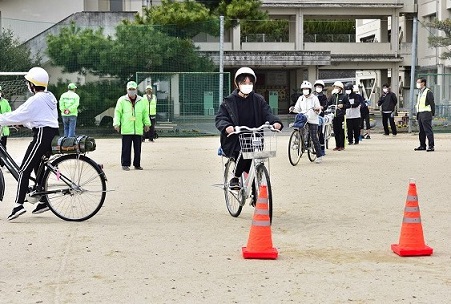 中学校に入学すれば、すぐ4月には学校で自転車教室が開催され交通安全の理解を深める機会があるわけですが、それまでの間に、まさに、ほんの少しの最初の時期の通学時に、慣れない大人用自転車によって、交通事故に遭わないように、とりわけ荷台に乗せた重いカバンが荷崩れを起こし、ゴム紐が車輪に絡んだり、大事故にならないようにということで、一足早く自転車教室が行われました。