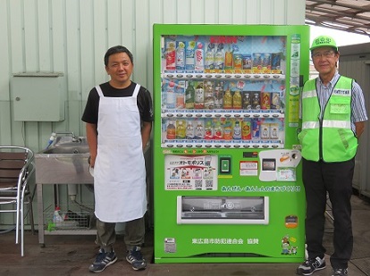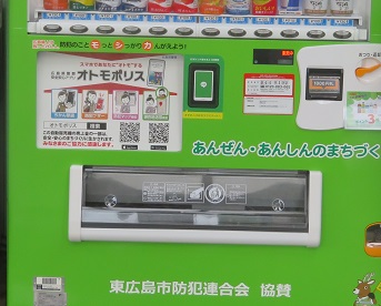7月11日、市内土与丸にあるパン屋さん「あすなろベイキングカンパニー」様に地域防犯活動支援型自動販売機を設置いただきました。東広島市防犯連合会としては平成27年に「カギの110番」様に1号機を導入いただき、今回12号機となります。