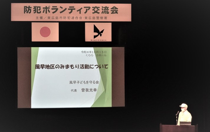 本年のボランティア活動発表は「風早子供を守る会」曽我光幸様が行われました。また、交流会前日に広島県の防犯作文コンクールにおいて東広島市立松賀中学の山田塔子さんが見事「優秀賞」を受賞の吉報があり、司会の原さおりさんから会場にて朗読していただきました