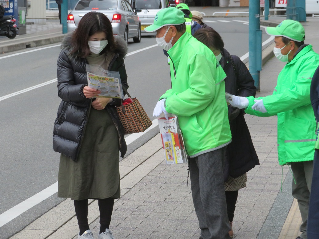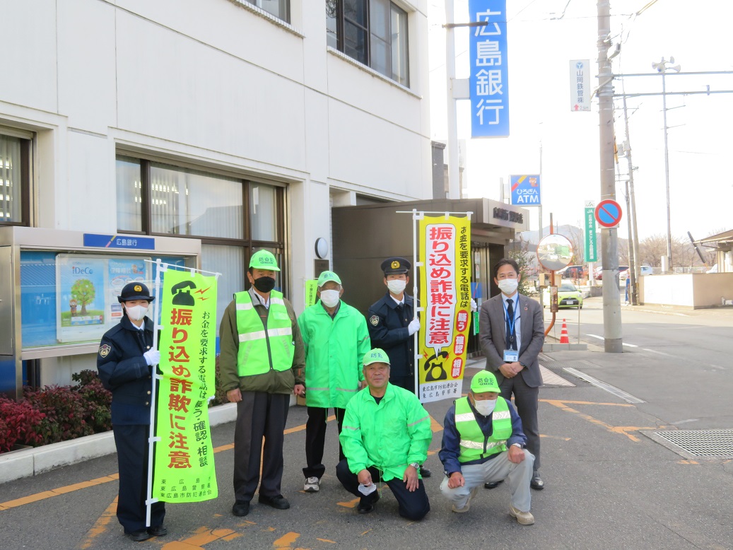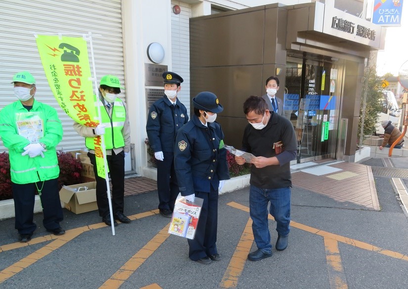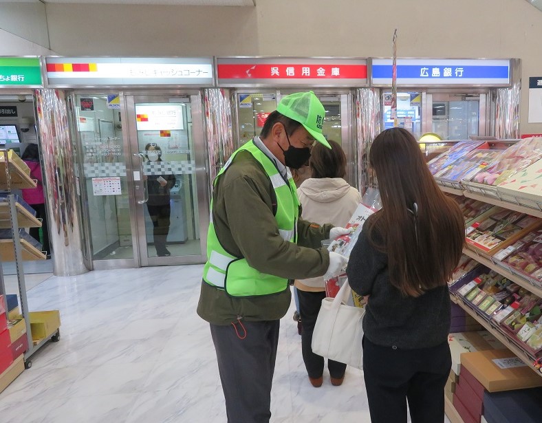 東広島市防犯連合会は防犯ボランティアの方々と東広島警察署、東広島市と共同し、年金支給日の偶数月15日には、特殊詐欺被害撲滅に向けた啓発活動を行っています。