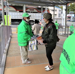 配った啓発用品は、チラシの他、預金通帳用のメッシュケース、特殊詐欺防止対応の電話メモ帳、ウエットティッシュなど100セット。