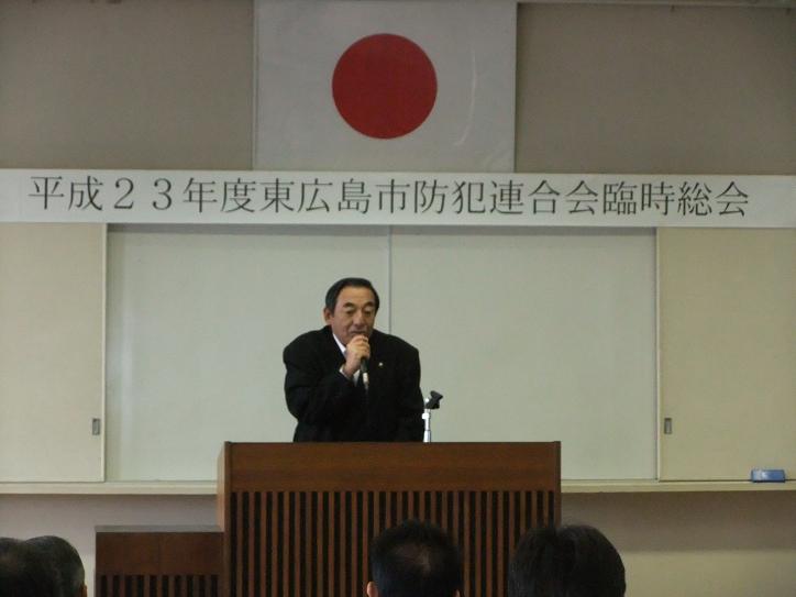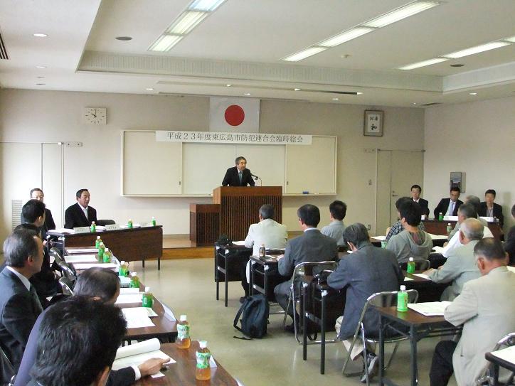 5月22日東広島警察署の5階で臨時総会を開催しました。今年度は当連合会の役員に多くの新任の方を選出すると共に、地域の防犯活動の更なる活性化を図るため各地域のまもり隊(57隊)の代表の方々に会員として参加頂きました。また、当連合会顧問の東広島市長藏田義雄様、東広島警察署長酒井敏行様にお言葉を頂き、皆さんのボランティア活動への意気込みも新たになっていました。