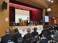 最初に、防犯連合会杉井会長の開会あいさつ、並びに藏田市長様、坂本市会議長様から御来賓としてのお祝辞を頂き、引き続き、作文などの防犯作品表彰があり、酒井東広島警察署長様から表彰状と記念品が授与されました。そのあと、中学校の生徒さんからの発表がありました。発表があったのは、