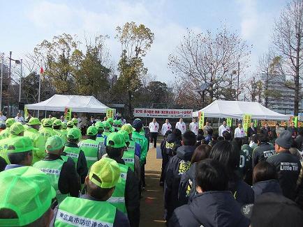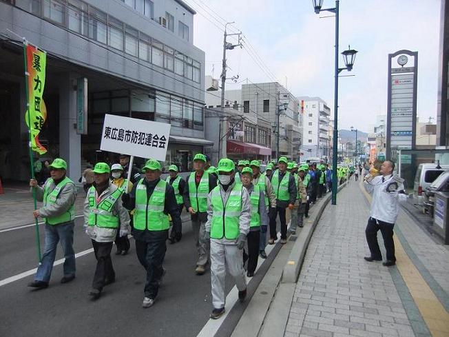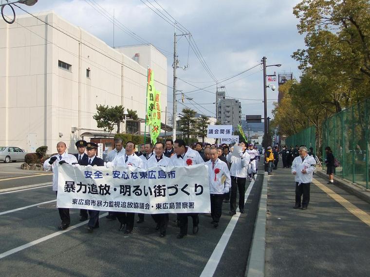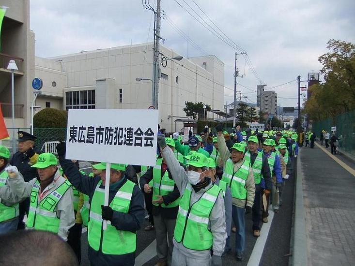 私たち「東広島市防犯連合会」からはボラティアの「地域安全推進員」の方や、小学校の登下校の「見まもり隊」の皆さん、約100人が参加し、賀茂台地の冬空に向け「暴力団は出て行け!!」「暴力団にお金は渡さないぞー!!」「安全な街をつくるぞー!!」と大きな声でシュプレヒコールを行いました。