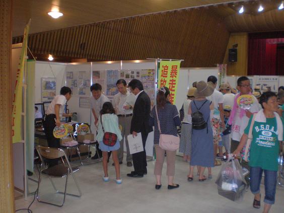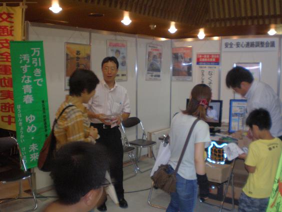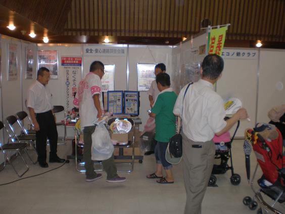 防犯連合会は、市の「安全・安心連絡調整会議」の一員として、同展示ブースに出展し、暴力団監視追放協議会、交通安全協会のそれぞれの啓発活動と共に、主に「振り込め詐欺防止」「自転車盗難防止」についての啓発活動を行いました。