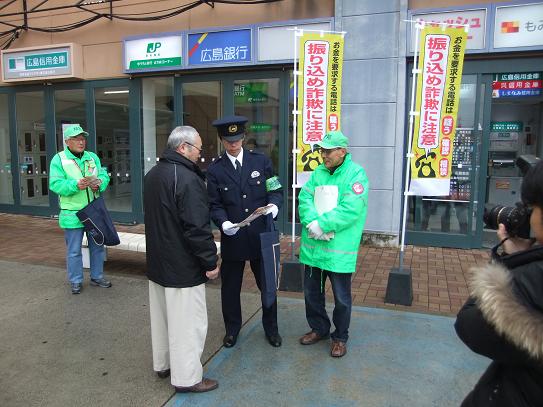 頻発する振り込め詐欺の対策として、2月15日の年金支給日にあわせ東広島市内の2カ所(フジグラン、ゆめタウン黒瀬店)において振り込め詐欺防止啓発キャンペーンを行いました。