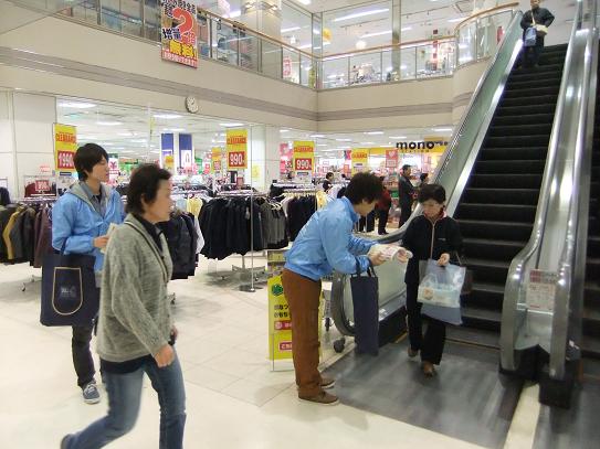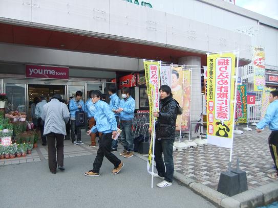 ゆめタウン店内でチラシを配る大学ボランティア隊