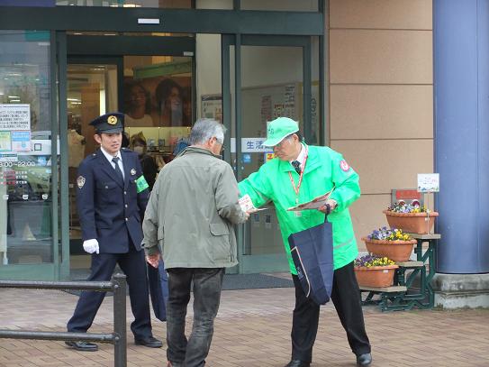 チラシ、ティッシュを配布する警察官と防犯連合会地域安全推進員