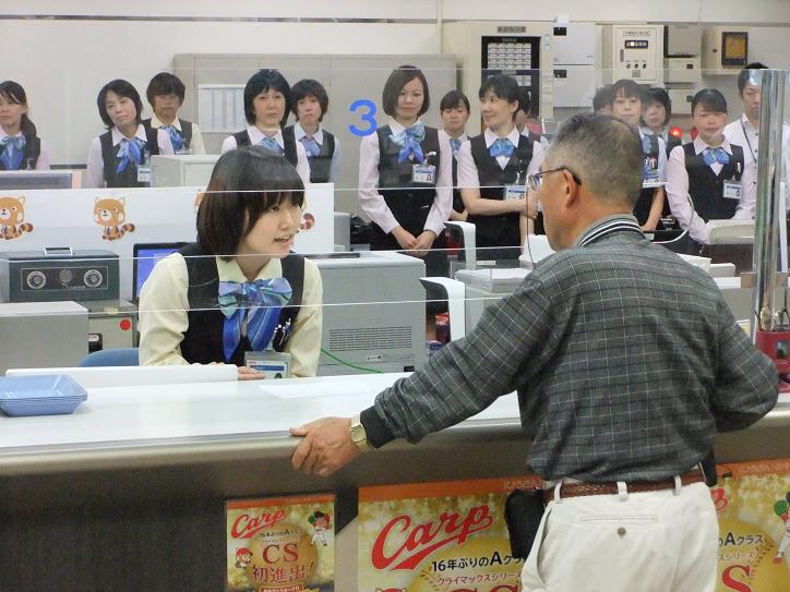 10月4日、東広島警察署と東広島防犯連合会は全国地域安全運動に先がけ、広島銀行西条支店において、特殊詐欺に対応した「銀行窓口における声かけ訓練」を実施しました。被害者役に地域安全推進員の石井さんが扮し「必ず儲かる話があると勧誘をうけ、急ぎ銀行窓口で、300万円を引き出そうとします」 が窓口の行員が「これはおかしいと再考を促します」それでも聴かない様子から、窓口責任者が再度説得を試みます。最後は支店次長さんが警察に通報するという流れで訓練を行いました。